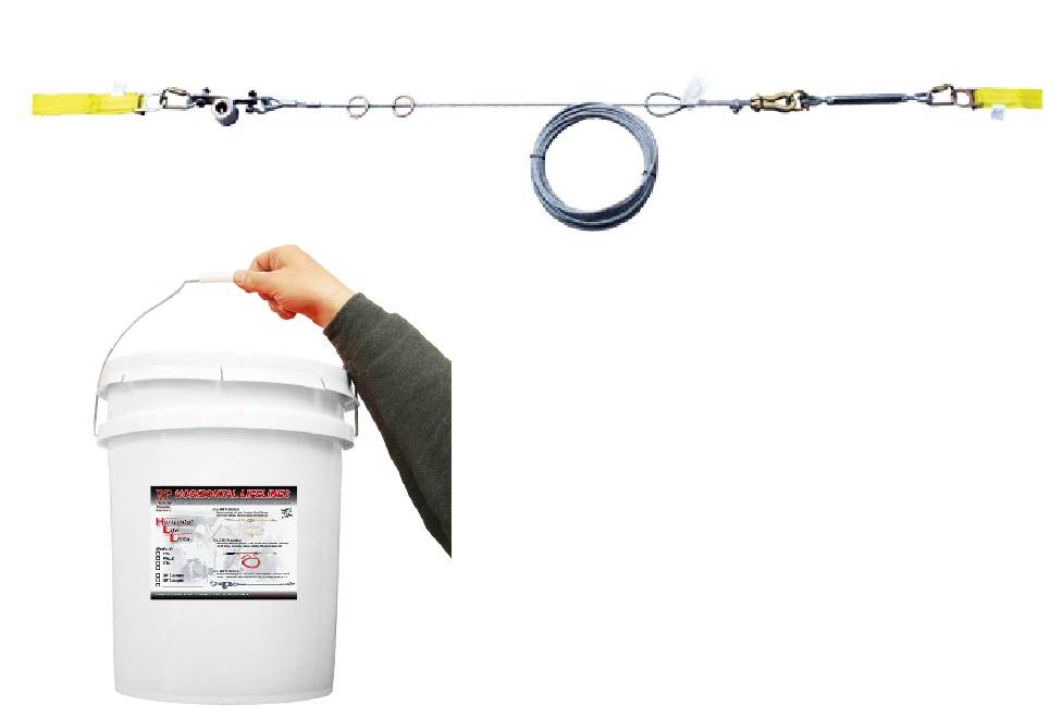 Features Feature 1 Ideal In Situations Such As Welding, Where Sparks Or Harsh Enviroments Are Present. Feature 2 Highly Portable Feature 3 Includes Carry Bucket System Includes 1 Qty Wire Rope Lifeline Assembly And Tensioner, 2 Qty Sliding Tie-Off Rings, 1 Qty Stainless Steel Coil Energy Absorber, 2 Qty 10' Tie-Off Anchorage Straps
