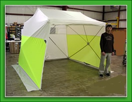 The Pop N Work Fx-8810 Ground Fx Tent Features A Large 8' X 8' Tent With A Full-Width Velcro Rollup Door On The Front. The Fx Tent Has An X-Frame In The Rear Wall. When The Side Frames Are Popped Out, It Telescopes Automatically Giving The Tent More Stability In Windy Conditions And Extra Support Important For Large Tents. Also, 14' Ropes Are Attached To Each Corner Of The Tent At The Roof For Windy Conditions.