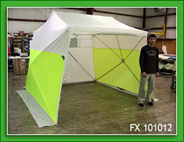 The Pop N Work Fx-101012 Is A 10' X 10' Fx Tent With A Full-Width, Two-Zipper Rollup Door. The Fx Tent Has An X-Frame In The Rear Wall. When The Side Frames Are Popped Out, It Telescopes Automatically Giving The Tent More Stability In Windy Conditions And Extra Support Important For Large Tents. Also, 14' Ropes Are Attached To Each Corner Of The Tent At The Roof For Windy Conditions.