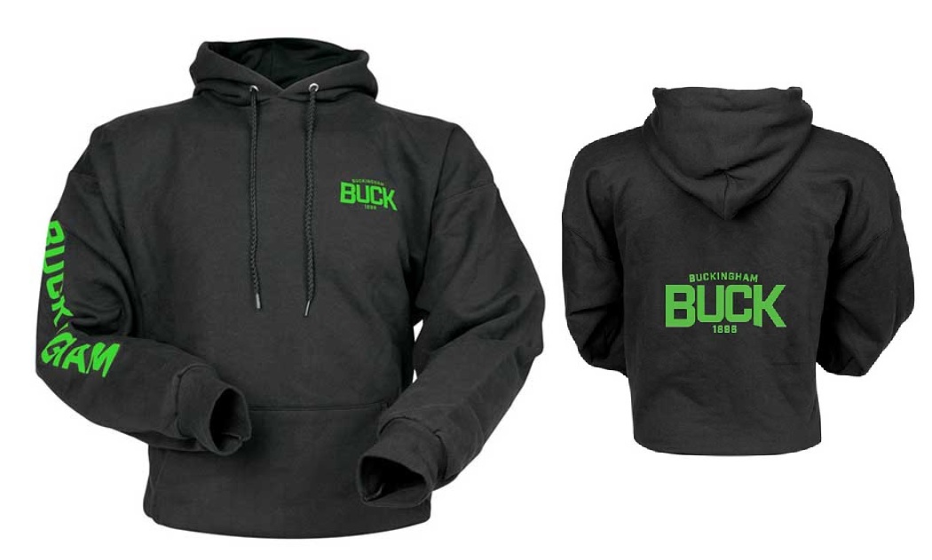 Our Buck-Hoodie Features Our Trademarked Logo On The Front And Back With Buckingham Featured Down The Right Sleeve.