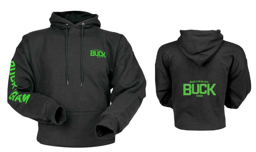 Our Buck-Hoodie Features Our Trademarked Logo On The Front And Back With Buckingham Featured Down The Right Sleeve.