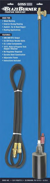 Goss Kp-320Ma Blazeburner Torch Kits & Torches Torch Kit Used For Roofing, Thawing, Weed Burning And Many Other Applications That Require Large Volumes Of Heat. Each Uses Vapor Propauses Vapor Propane Fuel And Has A Durable Handle With Rear On/Off Control Valve. Kit Includes: Ap-20 Torch With Piezoelectric Igniter Tip Hpx-10 10 Ft. Hose With Cylinder Adaptor