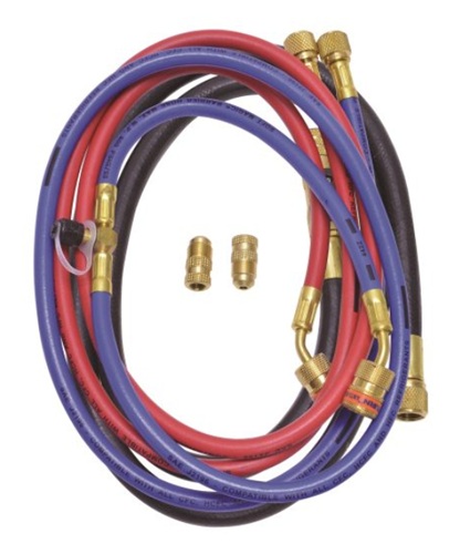 Uniweld P/N Ezf6Hs 72 Inch (180Cm) Fast-Flo Hose Set Red Hose: Ez Turn 1/4 Inch Hose Blue Hose: Ez Turn 1/4 Inch Hose With An Ez Access “T” Fitting™ For Micron Gauge Connection. Black Hose: 3/8 Inch Charging And Vacuum Hose With Full Flow Ball Valve Shutoff T Fitting: Blue Hose Adaptors: (2) 3/8 Inch X 1/4 Inch Tank Adaptors For 3 Times Faster Vacuum Than Standard 1/4" Hose