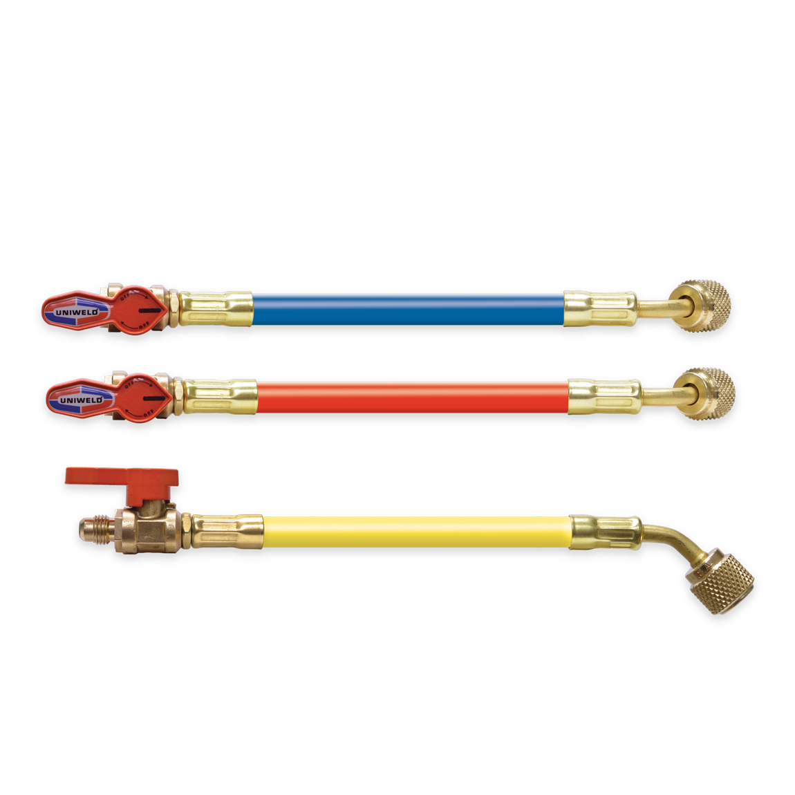 Uniweld’S Soft Magic® Barrier Ball Valve Hose Has Our Universal Ball Valve With Patented Interchangeable Service Connectors And Flex Service Hoses That Connect Easily To That Hard-To-Reach Access Fitting. Easy-Snap-In Service Connectors Available: Straight, 45° Bend, 90° Bend Or A 6" Service Hose. Maximum Working Pressure Is 800 Psi With A Burst Pressure Of 4000 Psi.