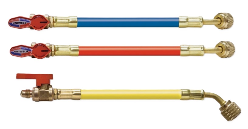 Uniweld P/N Ubv146S 1/4 Inch Ball Valve, Vacuum Rated To 20 Microns With Hose Set (1 Each - Red, Yellow, Blue) Hose Length 72 Inch | 180Cm