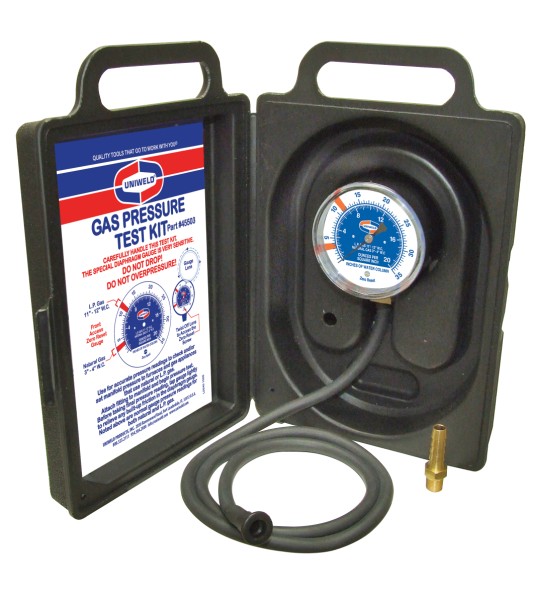 Uniweld Gas Pressure Test Kits Include: - Diaphragm Gauge That Accurately Sets Manifold Pressure For Natural Or Lp Gas. - Brass Fitting (Barbed X 1/8 M.P.T.) And Rubber Tube With Nipple For Easy Connection To Manifold. - High Impact Protective Plastic Case. - Instructions Included.
