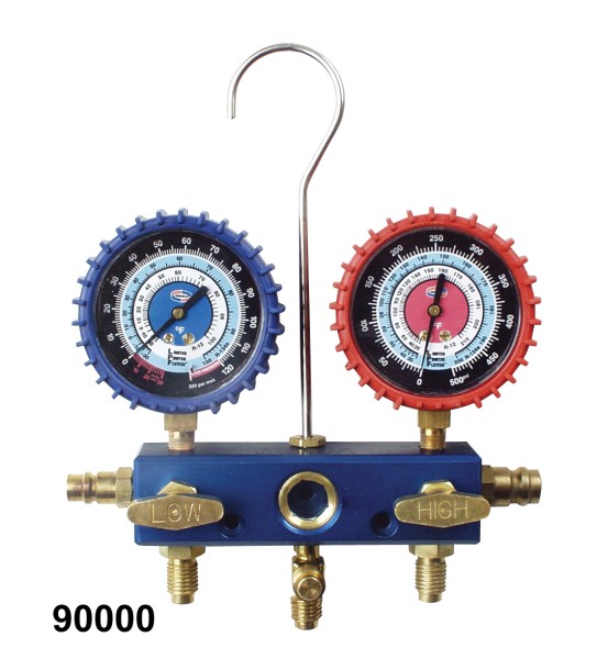 The R-134A Automotive Anodized Aircraft Aluminum Block Manifold Features A Large Optical Sight Glass For Monitoring Refrigerant. High And Low Side Brass Front Valves Provide Precision Control. Optional Manual Or Automatic Service Couplers Available With Either 2.5” Or 800Mm (3-1/8”) Gauge Manifolds.