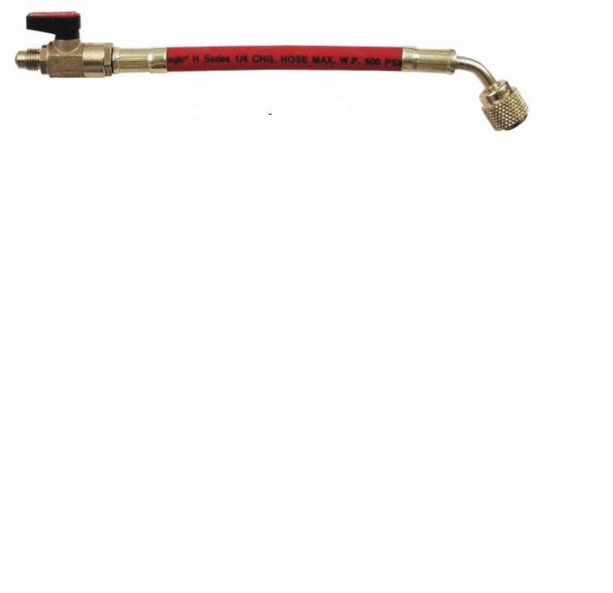 Soft Magichose, Red 6” Enviro Adaptor Hoses Inline Ball Valve 1/4 Inch M.F. X 3/16 Inch F.F. 45 Degree Bend 1/4 Chg Hose Max W.P 500 Psi