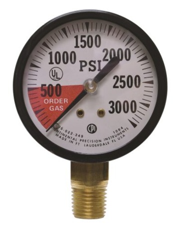 High Pressure CO2 gauge with red zone for gas order alert. For use with CO2 or other compressed gases. Available with side mount or bottom mount; right or left hand threads. NOT for OXYGEN service.