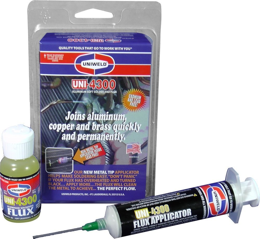 10 Ft. Coil Aluminum Solder 2 Oz. Uni-4300 Aluminum Soft Solder Flux With Metal Tip Flux Applicator Weight: 8.9 Ounces