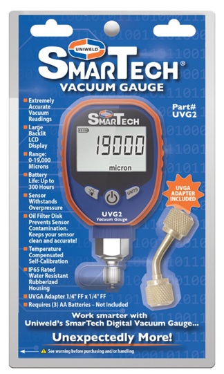 Uniweld Uvg2 Digital Vacuum Gauge Provides Unsurpassed Vacuum Accuracy And Quickly Measures Vacuum In Microns, Pascals, Millibar, And Mmhg With A Resolution Down To 1 Micron. Oil Filter Disk Prevents Sensor Contamination. Keeps Your Sensor Clean And Accurate! Temperature Compensated Self-Calibration. Large, High-Visibility Backlit Lcd Display. Requires (3) Aa Batteries - Not Included Specifications: – Range: 0-19,000 Microns, 2533.13 Pa, 25.3 Mgar, 19 Mmhg. – Resolution: 1 Micron (0-400), 10 Micron (400-3000), 100 Micron (3000-10000), 250 Micron (10000-19000). – Select From 8 Different Vacuum Units: Micron, In Hg, Torr, Psia, Mbar, Mtorr, Pa, Kpa. – Sensor Withstands Overpressure Up To 400 Psi. – Ip65 Rated Water Resistant Rubberized Housing