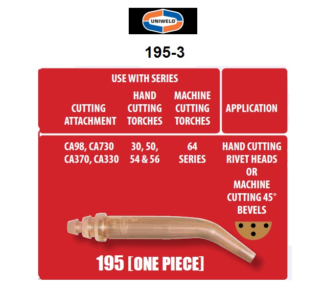 Use With: Cutting Attachment: Ca98, Ca730, Ca370, Ca330 Hand Cutting Torches: 30,50,54,56 Machine Cutting Torches: 64 Series Application: Hand Cutting Rivet Heads Or Machine Cutting 45° Bevels