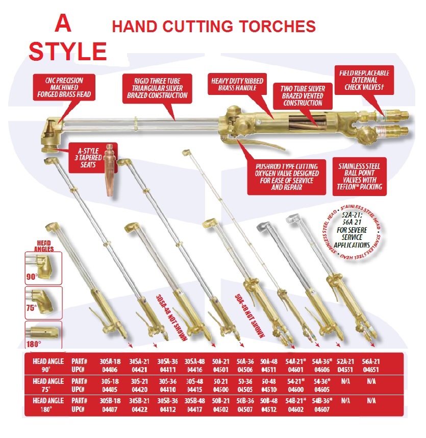 Head Angle : 90 Degree Torch Length : 18" Weight : 58 Oz. Lever Position : Bottom Rear Cutting Capacity : 12" Tip Style : A