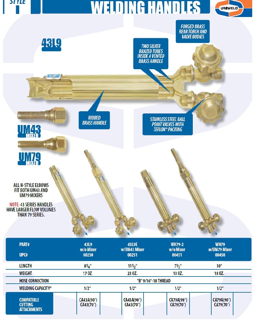 Uniweld 43L9E / Upc 00251 Welding Handle 11-1/2 Inch Hvy Duty W/Um43 Mixer Minimum Order 1