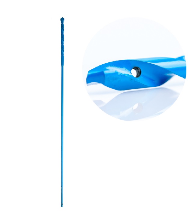 Aggressive Tip Drills Through Wood, Masonry, And Other Similar Materials With Ease Holes On The Bit Head And Chuck Allow For Pulling Of Wires After Drilling 24" Length For Even Greater Reach Than Standard Drill Bits Black Oxide Coated Shaft And Powder Coated Blue For Greater Rigidity, Durability, And Rust Resistance