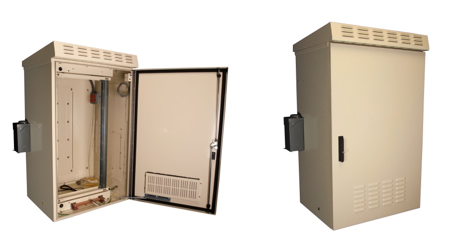 21Ru Wall/Unistrut Mount With 19" Wide Swing Out Rack, 10-32 Threads Eia/Tia Spacing, 3 Point Latch And Piano Hinge, Wind Stop. 50"H X 29"W X 24"D. Main Body: Powder Coated Aluminum. Hardware: Stainless Steel. 20/240Vac Service Entrance, 20 Amp. Circuit Breaker, Surge Protector, (2) Duplex Receptacle, 125V, 20A Ground Bar. Can Include A/C Or Heat Exchanger. (4) Dual Stage Knockouts 1-3", Located Front Right Of The Cabinet. Wall Pole Mounted.