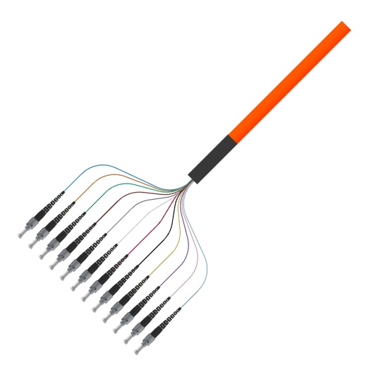 Fiber Optic Pigtail 065-377-10-Ml St/Upc, 12 Fibers Jacketed, St/Upc To Stub, Riser Rated, Ofnr Ft-4, Multimode 62.5/125µm, Om1, 8" Breakout