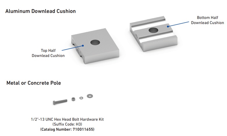 Features And Benefits • Firmly Secures Opgw To Poles And Structures Without Compromising Opgw Integrity • Standard Cushion Has Two Grooves To Support Each Opgw Downlead • Made From An All-Aluminum Alloy That Provides An Electrical Path From The Opgw To The Structure For Bonding Purposes Or Urethane • Kits Can Include Mounting Accessories To Secure The Downlead Cushion To Poles (Wood, Concrete, Or Metal) Or Lattice Towers