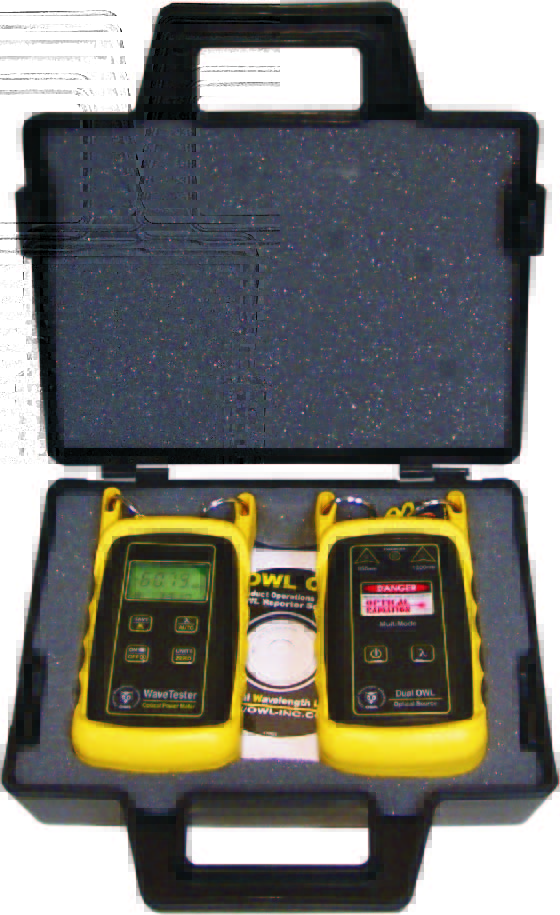 Kit Contents Power Meter: Wavetester Light Source: Dual Owl Optical Wavelength Laboratories 850 Accessories: Owl Optical Wavelength Laboratories Reporter Software Product Manuals Download Cable 9-Volt Batteries Nist Certificate Carrying Case Protective Rubber Boots