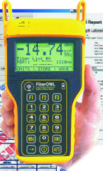 Applications: The Fiber Owl Optical Wavelength Laboratories 4 Vfl Is A High Accuracy, High Resolution, Microprocessor Controlled Optical Power Meter. The Meter Has A 75Db Dynamic Range Making It Ideal For Both Singlemode And Multimode Fiber Testing. An Integrated Visual Fault Locator Port Allows For Quick And Easy Visual Fault Location Or Visual Fiber Identification. It Is Much More User-Friendly Than Previous Versions Of The Fiber Owl, Including An Optional Upgrade To Include Fiber Link Length Testing. When Used With Owl Optical Wavelength Laboratories Wavesource Light Sources, Its Autowavelength Recognition Feature Detects The Wavelength Being Received From The Light Source And Automatically Switches To That Wavelength, Allowing Simultaneous Dual-Wavelength Optical Referencing And Data Storage. This Feature Increases Productivity By Decreasing Testing Time And Human Error. It Has An Attractive Handheld Case Made From High Impact Plastic Surrounded By A Protective Rubber Boot, A Large, Backlit, Graphic, Liquid Crystal Display, And 18-Key Keypad For Easy Data Entry. The Fixed Universal Connector Port Accepts 2.5Mm Ferrule Connectors, Including St, Sc, And Fc. It Will Operate For Over 100 Hours On A Standard 9-Volt Battery And Has Built-In Auto Shutdown. The Fiber Owl Optical Wavelength Laboratories 4 Vfl Includes A Built-In Loss Wizard That Helps You Easily Calculate The Allowable Loss For The Fiber Runs That You Will Be Measuring. The Meter Stores Physical Fiber Information For Up To Eight Links. Link Information Includes: Link Name, Date, Fiber Type, Fiber Length, Connectors, Splices, Temperature, And Calculated Or Userdefined Reference Power Values. In Addition, The Meter Will Store Up To 1000 Measured Data Points With Labels. Each Value Includes The Fiber Type And Link. The Stored Information Can Be Selectively Viewed, Edited (Measured Again), Printed, Or Deleted. The Meter Will Print Formatted Reports Of Selected Stored Data Directly Using The Built-In Usb Port, Or All Of The Stored Data Can Be Downloaded To A Computer Spreadsheet Or Our Free Owl Optical Wavelength Laboratories Reporter Software To Produce Formatted Certification Reports.