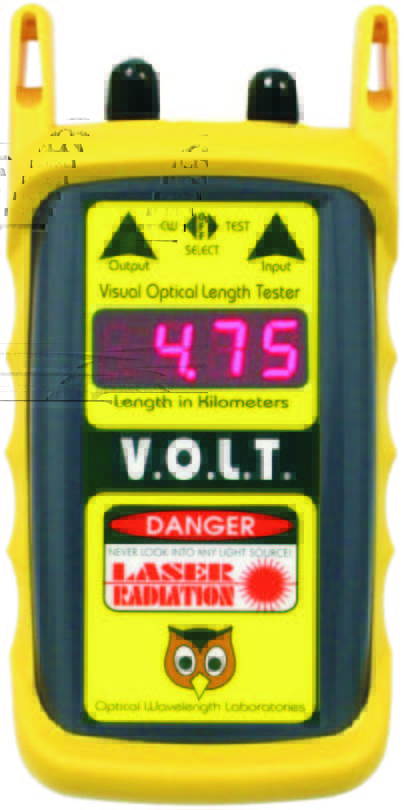 Applications: Volt Stands For Visual Optical Length Tester, And Offers A Unique, Low-Cost Alternative For Users Who Need To Measure The Length Of Optical Fibers. Fiber Installations Are Increasingly Required To Have Fiber Length Measurements To Comply With Bid Requirements. Rather Than Purchase Certification Test Sets That Can Cost Thousands Of Dollars, The Volt Can Be Added To An Installer’S Existing Fiber Test Kit. These Length Testers Use A “Round-Robin” Method Of Measuring Fiber Length. This Is Accomplished By Looping Back Two Fibers At One End Of The Fiber Run With A Patch Cord. The Round Trip Time That The Light Takes To Travel Through Both Fibers Is Converted To Length In Kilometers, Then Divided By Two To Show The Length Of The Fiber Cable. There Is No Need To Measure The Length Of All The Fibers; The Length Measurement Can Be Applied To All Fibers In The Cable. This Method Of Length Testing Provides Accurate Measurements, And Saves Time And Money. Measuring Fiber By The Jacket Is An Accepted Method Of Measurement; However, There Are Many Scenarios Where This May Not Be Valid. Length Markings May Be Hard To Reach If They Are Already Terminated In A Patch Panel. Fiber Links May Also Go Through Multiple Cross-Connects Or Have Splices In The Middle, Thereby Making Jacket Markings Invalid. Optical Measurement Of Fiber Produces Accurate Results Without The Need For Jacket Markings. Optical Measurement Also Saves Time By Eliminating The Need To Estimate The Length Of The Fiber Run With A Measuring Wheel. This Method Is Especially Troublesome And Inaccurate In Networks That Traverse Walls, Are In A Star Topology, Or Contain Riser Cables. The Volt Uses A Visible Laser That Can Measure Fiber Links Of Up To 1.5 Kilometers, And Is Accurate To Within ±2.5 Meters. In Addition To Length Testing, The Volt’S High-Intensity Laser Permits It To Do Double Duty As A Visual Fault Locator, And A Pulsing Mode Allows For Easy Fiber Identification.