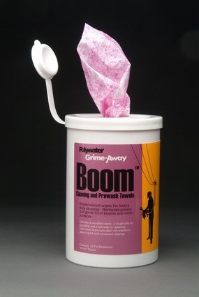 Boo Prewash Wipes Are Cleaner-Saturated Towels That Clean Grease, Tar, Creosote, Salt Spray*, Hydraulic Fluid, Pine Pitch, And Road Debris Off Fiberglass Boom Arms. The Cleaner Is Water Soluble, And Washes Off During Subsequent Water Rinsing. Boom Wipes Don'T Adversely Affect The Gel Coat On Booms. Available In 2 Different Packages. Boom Wipes In The Catalog #B-D72 Self-Dispensing Canister Won The 2004 Utility Products Magazine Readers Choice Award!