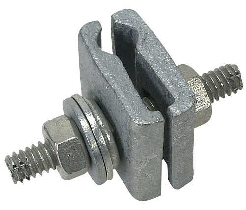 Plates Secured By A Threaded Stud With A Flanged Shoulder And Washer To Block Slippage, And Two Hexagonal Nuts: One On The Long End Of The Stud To Tighten The Clamp, One On The Other End To Terminate The Wire Against The Two Washers