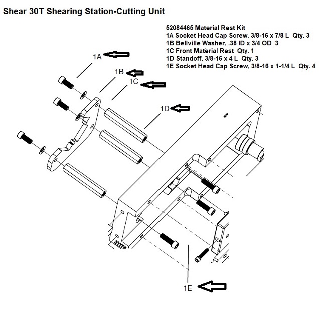 52084465 Material Rest Kit 1A Socket Head Cap Screw, 3/8-16 X 7/8 L Qty. 3 1B Bellville Washer, .38 Id X 3/4 Od 3 1C Front Material Rest Qty. 1 1D Standoff, 3/8-16 X 4 L Qty. 3 1E Socket Head Cap Screw, 3/8-16 X 1-1/4 L Qty. 4