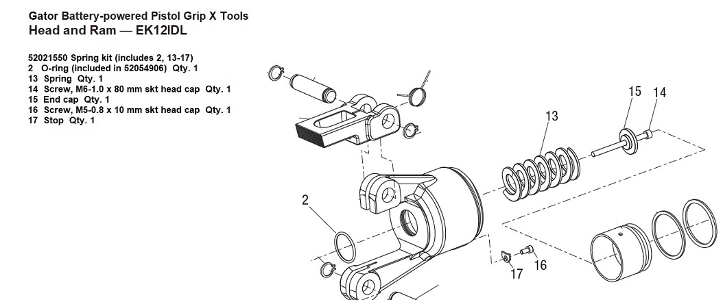 52021550 Spring Kit (Includes 2, 13-17) 2 O-Ring (Included In 52054906) Qty. 1 13 Spring Qty. 1 14 Screw, M6-1.0 X 80 Mm Skt Head Cap Qty. 1 15 End Cap Qty. 1 16 Screw, M5-0.8 X 10 Mm Skt Head Cap Qty. 1 17 Stop Qty. 1