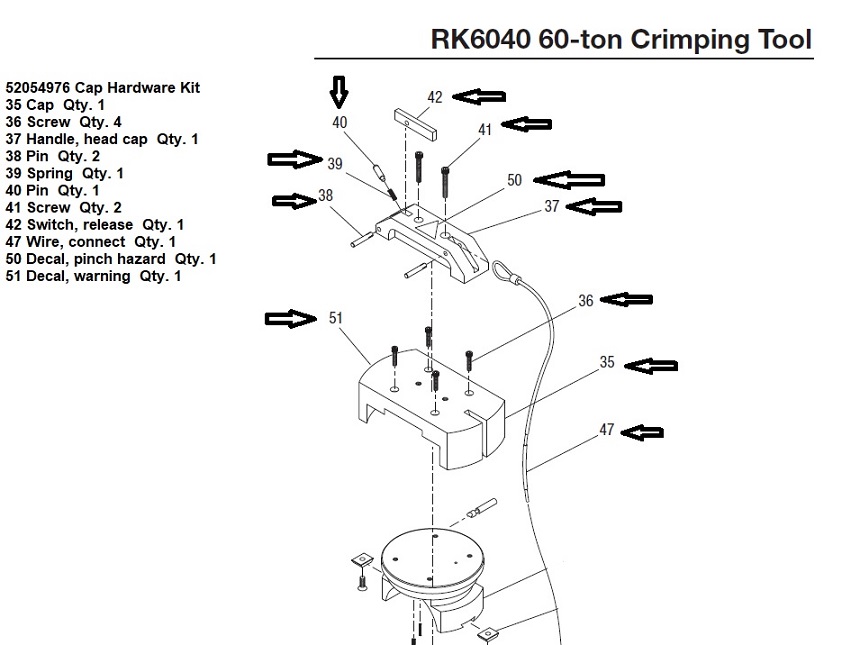 52054976 Cap Hardware Kit 35 Cap Qty. 1 36 Screw Qty. 4 37 Handle, Head Cap Qty. 1 38 Pin Qty. 2 39 Spring Qty. 1 40 Pin Qty. 1 41 Screw Qty. 2 42 Switch, Release Qty. 1 47 Wire, Connect Qty. 1 50 Decal, Pinch Hazard Qty. 1 51 Decal, Warning Qty. 1