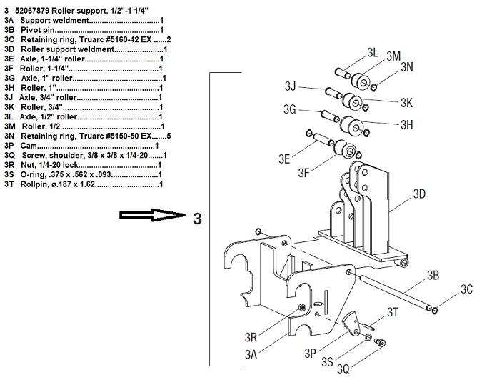 Key Part No. Description Qty 3 52067879 Roller Support, 1/2"-1 1/4" 3A Support Weldment.................................1 3B Pivot Pin.................................................1 3C Retaining Ring, Truarc #5160-42 Ex ......2 3D Roller Support Weldment.......................1 3E Axle, 1-1/4" Roller...................................1 3F Roller, 1-1/4"..........................................1 3G Axle, 1" Roller..........................................1 3H Roller, 1"................................................1 3J Axle, 3/4" Roller......................................1 3K Roller, 3/4".............................................1 3L Axle, 1/2" Roller......................................1 3M Roller, 1/2...............................................1 3N Retaining Ring, Truarc #5150-50 Ex.......5 3P Cam.......................................................1 3Q Screw, Shoulder, 3/8 X 3/8 X 1/4-20.......1 3R Nut, 1/4-20 Lock.....................................1 3S O-Ring, .375 X .562 X .093......................1 3T Rollpin, Ø.187 X 1.62..............................1