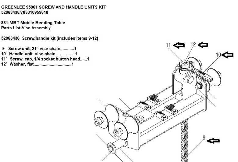 9 Screw Unit, 21" Vise Chain............1 10 Handle Unit, Vise Chain.................1 11* Screw, Cap, 1/4 Socket Button Head......1 12* Washer, Flat.................................1