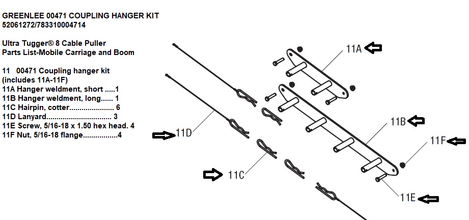 11 00471 Coupling Hanger Kit (Includes 11A-11F) 11A Hanger Weldment, Short ...................... 1 11B Hanger Weldment, Long........................ 1 11C Hairpin, Cotter...................................... 6 11D Lanyard............................................... 3 11E Screw, 5/16-18 X 1.50 Hex Head......... 4 11F Nut, 5/16-18 Flange.............................. 4