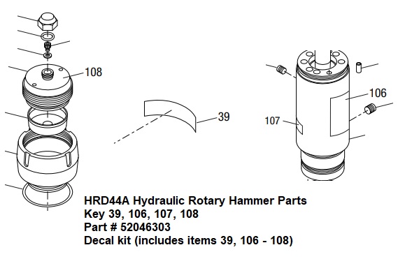 Catalog # 10147 Part # 52046303 Decal Kit (Hrd44A) H2 Decal Kit (Includes Items 39, 106, 107, 108) Used With The Hrd44A Hydraulic Rotary Hammer Upc # 783310101475 Weight 0.10