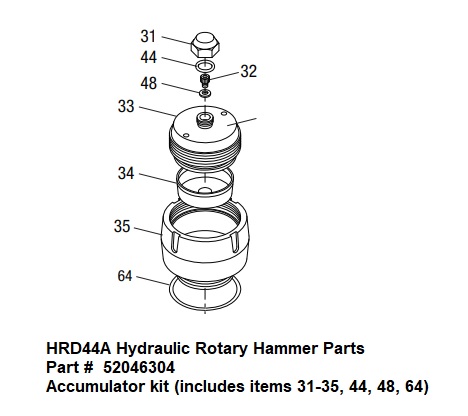 Catalog # 10148 Part # 52046304 Accumulator Kit (Includes Items 31-35, 44, 48, 64)H2 Upc # 783310101482 Used With The Hrd44A Hydraulic Rotary Hammer. Weight : 1.50 Lbs.