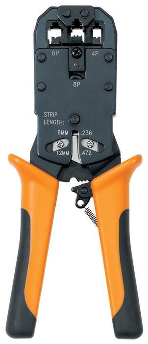 Crimps 4-Position Rj22 Connectors Crimps 4- And 6-Position Rj11/Rj12 Connectors Crimps 8-Position Rj45 (Non-Keyed) Connectors Embedded Cable Cutter And Stripper Crimps 28-24 Awg (.08 - .20 Mm2) Telephone And Data Cables Comfortable Rubber-Embedded Handles Built-In Safety Ratchet Release