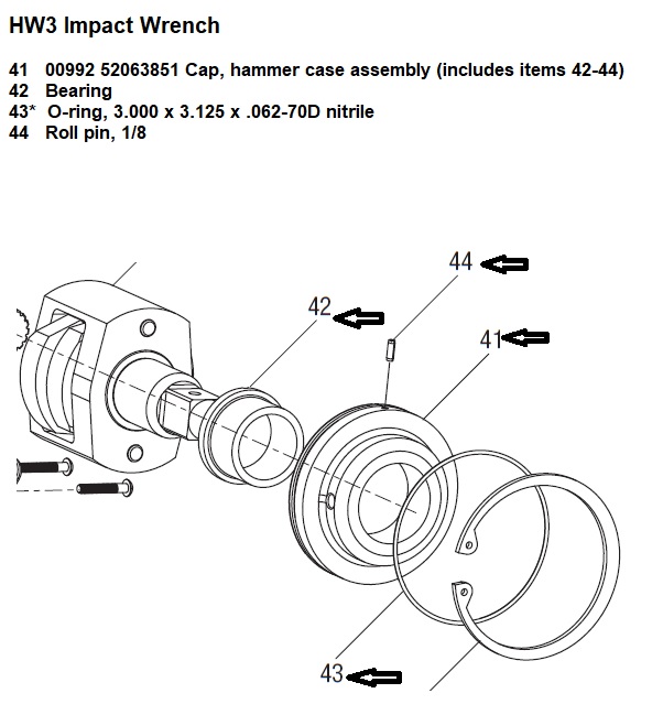 Hw3 Impact Wrench Parts 41 00992 52063851 Cap, Hammer Case Assembly (Includes Items 42-44) 42 Bearing 43* O-Ring, 3.000 X 3.125 X .062-70D Nitrile 44 Roll Pin, 1/8