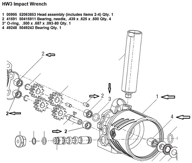 Hw3 Impact Wrench Parts 1 00995 52063853 Head Assembly (Includes Items 2-4) Qty. 1 2 41591 50415911 Bearing, Needle, .439 X .625 X .500 Qty. 4 3* O-Ring, .500 X .687 X .093-80 Qty. 1 4 49248 5049243 Bearing Qty. 1