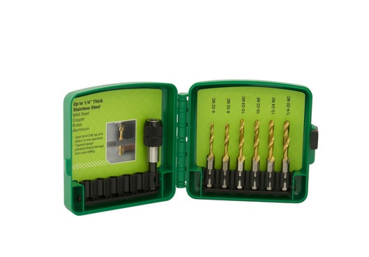 Specifications Type Drill/Tap Bits Application Stainless Steel, Mild Steel, Aluminum, Brass, Copper, Fiberglass And Plastics Size Includes 6-32, 8-32, 10-24, 10-32, 12-24, 1/4-20 Point Type Split-Point Tip Material High-Speed Steel Finish Titanium Nitride