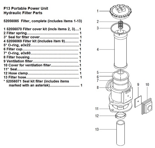 1 52056070 Filter Cover Kit (Incls Items 2, 3)...1 2 Filter Spring................................................. 1 3* Seal For Filter Cover..................................... 1 4 52056069 Filter Kit (Includes Item 9).............1 5* O-Ring, Ø3X22............................................. 1 6 Filter Cup..................................................... 1 7* O-Ring, Ø3X60............................................. 1 8 Filter Housing.............................................. 1 9 Ventilation Filter........................................... 1 10 Cover For Ventilation Filter........................... 1 11* Seal..........................................................1 12 Hose Clamp................................................1 13 Filter Hose...................................................1 * 52056071 Seal Kit Filter (Includes Items Marked With An Asterisk)..................................1