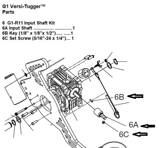 G1 Versi-Tugger™ Parts 6 G1-R11 Input Shaft Kit 6A Input Shaft ............... .............1 6B Key (1/8" X 1/8"X 1/2")..... .....1 6C Set Screw (5/16"-24 X 1/4")... 1