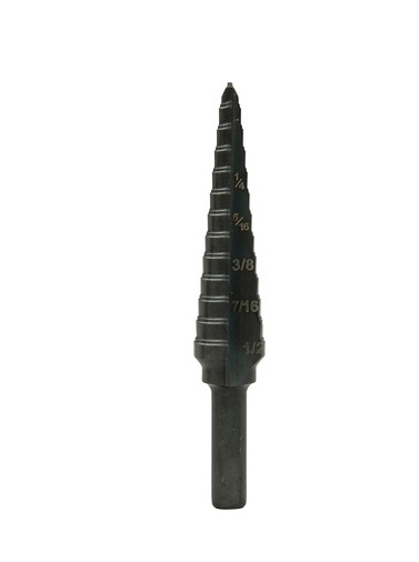 Specifications Type Multi-Hole Step Bit Application Cuts Mild Steel, Aluminum, Brass, Copper, Wood, Fiberglass, Plastics And Laminates Number Of Drill Stages 13 Minimum Drill Diameter 1/8" (3.2 Mm) Maximum Drill Diameter 1/2" (12.7 Mm) Maximum Sheet Metal Thickness 10 Gauge (3.5 Mm)