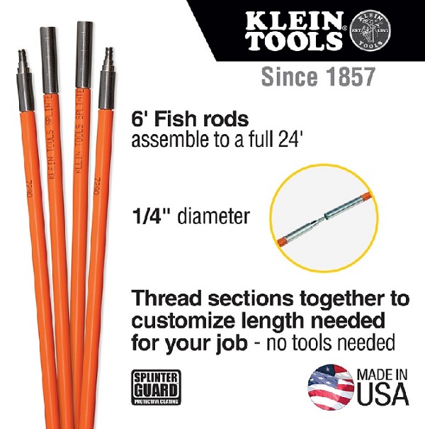 Four 1/4-Inch (6 Mm) Diameter X 6-Foot (1.83 M) Fish Rods Assemble To A Full 24-Feet (7.32 M) Thread Sections Together To Customize Length Needed For Your Job - No Tools Needed Durable Stainless Steel Connectors Protective Splinter Guard™ Coating Keeps Hands Free Of Fiberglass Splinters Made In Usa Bullet Nose And Hook Attachments To Attach And Grab Wires