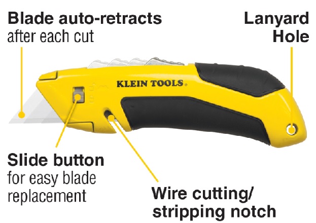 Utility Knife Incorporates A Wire-Stripping Notch Blade Auto-Retracts Fully Into Housing When Slider Is Released Safety Yellow Handle For Greater Visibility Blade Removal/Insertion Slide Button So No Need To Disassemble In Order To Change Blade Soft-Touch, Rubberized Handle Regions For No-Slip Grip Lanyard Hole For Tethering And Safekeeping Of Knife Heavy-Duty Durable Construction Uses Standard Utility Blades Cat. No. 44125