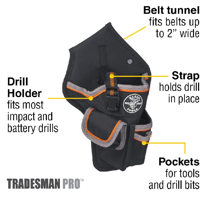 Klein Tools' Tradesman Pro Drill Pouch Is Designed To Fit Both Battery And Impact-Style Drills. A Strap Keeps The Drill Securely In Place. This Pouch Also Has Plenty Of Storage For Hand Tools And Drill Bits.