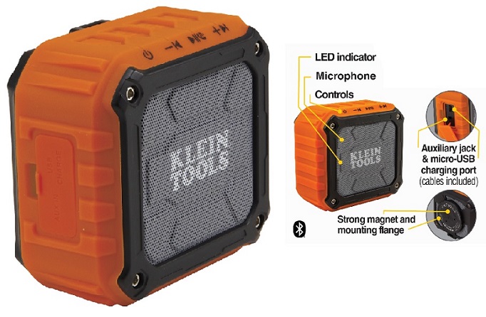Connects Wirelessly Or Via A Wired Auxiliary Input 32.8-Foot (10 M) Connectivity Range (In Open Space) 10-Hour Battery Life Drop Protected Up To 6.6-Foot (2 M) Powerful Rear Magnet Holds Speaker To Metal Surfaces (Panels, Ducts, Etc.) Twist-Lock Flange Mounts To Klein'S Lighted Tool Bag (Cat. No. 55431) 1/4-20 Threaded Mount On Bottom Allows Attachment To Any Standard Tripod Rated Ip45 Water/Dust Resistant Able To Answer Calls Hands-Free With The Built-In Speakerphone Includes 1/8-Inch (3.5 Mm) Stereo Auxiliary Cable And Micro Usb-To-Standard Usb Charging Cable