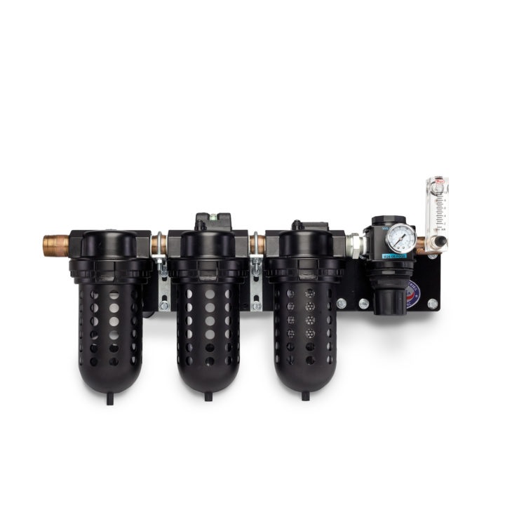 Filtration System: First Stage: 5 Micron Particulate Filter Element And Automatic Mechanical Drain Second Stage: 0.010 Micron Coalescing Filter Element And Manual Drain Third Stage: 0.003 Micron Activated Carbon Filter Element And Manual Drain Regulator: High Pressure, Adjusting Pressure Knob, 0-160 Psi (0-11.03 Bar) Pressure Gauge And External Relief Valve Flow Meter: Adjustable Metering Valve, Range From 0.0-1.0 Lpm