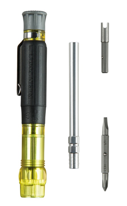 Hvac Screwdriver With Concealable Tips And A Pocket Clip For Easy Pocket Storage Three Different Tips In One Tool, Includes #0 Phillips, 1/8-Inch (3.2 Mm) Slotted, And A Schrader® Bit Rotating Cap For Optimum And Precise Control Versatile Interchangeable Barrel Has Both A Short And Long Side Cushion-Grip™ Handle For Maximum Comfort When Working On Small Equipment Steel Bits With Heat Treated Precision Ground Tips For Greater Strength Corrosion-Resistant Anodized Aluminum Barrel