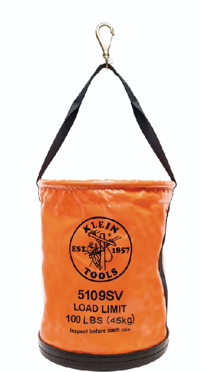 Bright Orange Color Gives This Utility Bucket Easy Visibility Tool Bucket Has Maximum Safe Load Rating Of 100-Pound (45 Kg) Water-Resistant Vinyl Helps To Keep Tools Dry 15-Inch (38.1 Cm) High Tool Bucket With 12-Inch (30.5 Cm) Diameter Holds Tools Securely Web Handle Extends Down The Sides Of The Bucket For Added Strength Swivel Snap Hook For Hoisting Black Molded Polypropylene Bottom
