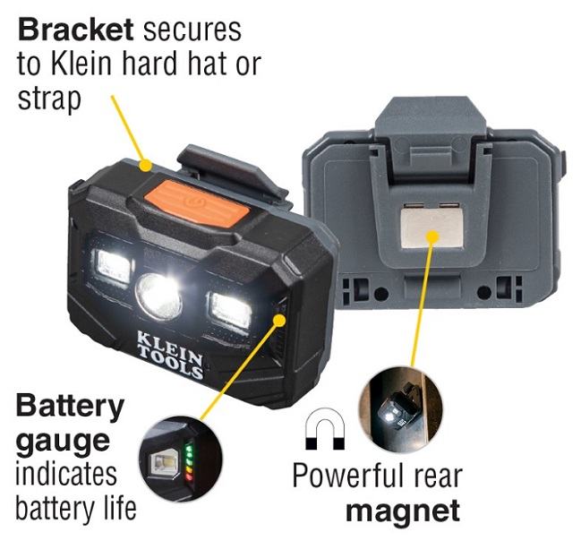 Rechargeable Headlamp Attaches Directly To Klein Hard Hats (Equipped With Bracket System) Mount Headlamp Magnetically With A Strong Backside Magnet For Use As A Work Light Smartly Designed Headlamp Also Attaches To Klein Bracketed Straps (Cat. No. 56060) Bright All-Day Light Has 3 Modes: Boost/All-On 300 Lumens For 4 Hours, 215 Lumen Spotlight For 9 Hours, And 100 Lumen Floodlight For 14 Hours Battery Gauge Indicates Level Of Battery Life With Colored Led Lights Slimmer Profile Light With Pivoting Mount Allows Up To A 64-Degree Lighting Angle Charges Via Usb-C Cable (Included) Durable Headlamp: Drop-Test Rating Of 6-Foot (1.8 M), Dust And Water Resistant